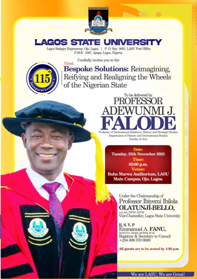 PROFESSOR ADEWUNMI JAMES FALODE TO PRESENT LASU’S 115TH INAUGURAL LECTURE ON TUESDAY, 25TH NOVEMBER 2025...