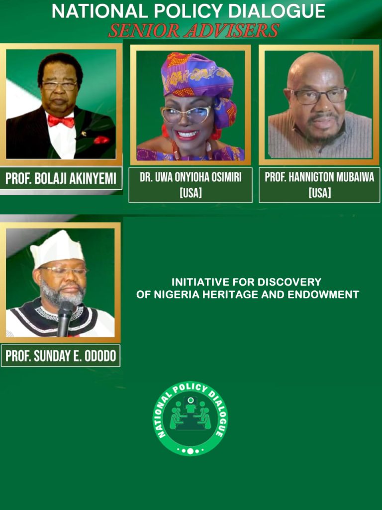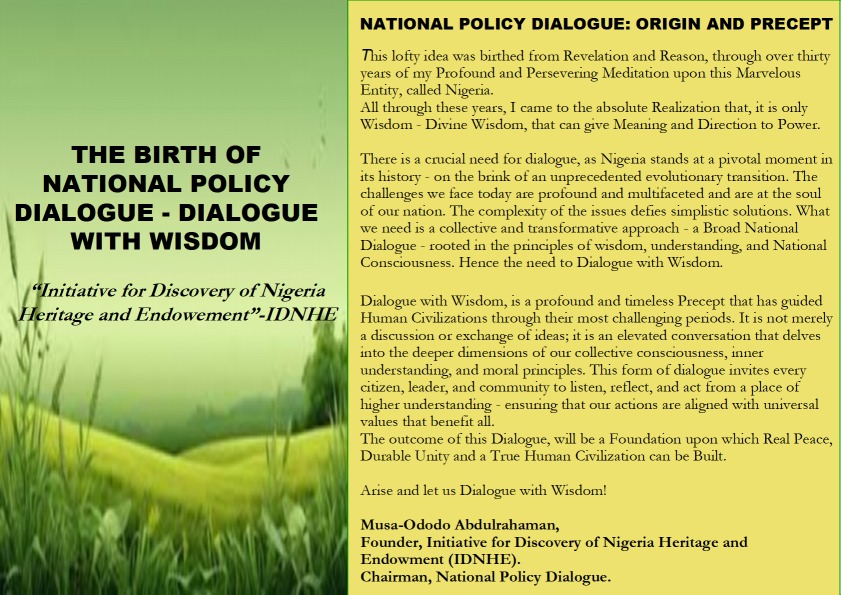 The National Policy Dialogue (NPD), convened under the Initiative for Discovery of Nigeria Heritage and Endowment (IDNHE), is founded on the profound realization that a Nation is more than a geographical entity. A Nation is the Spirit of its People, the Consciousness and